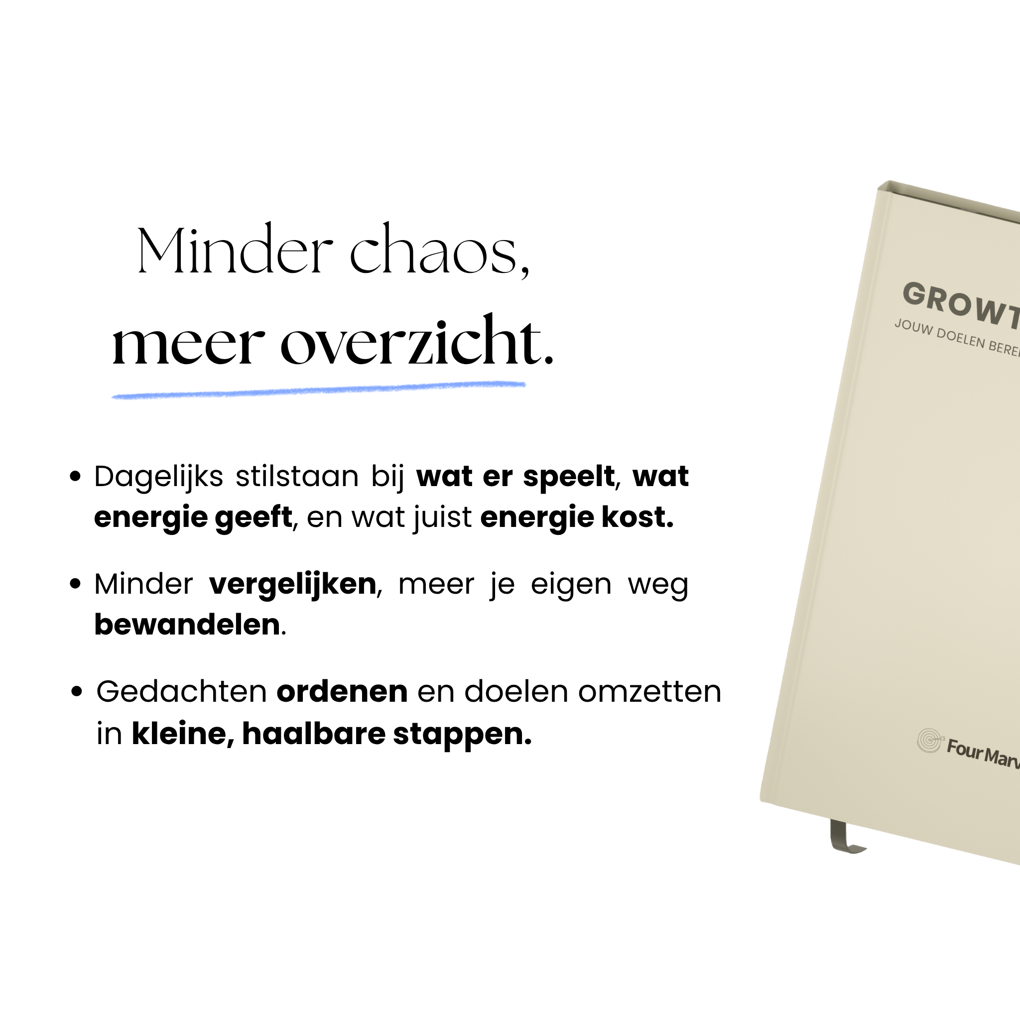 Wil je écht vooruitgang, maar blijf je vaak hangen in goede voornemens? De Growth Journal helpt je doelen helder te maken, gewoontes vol te houden en rust te creëren in je hoofd.