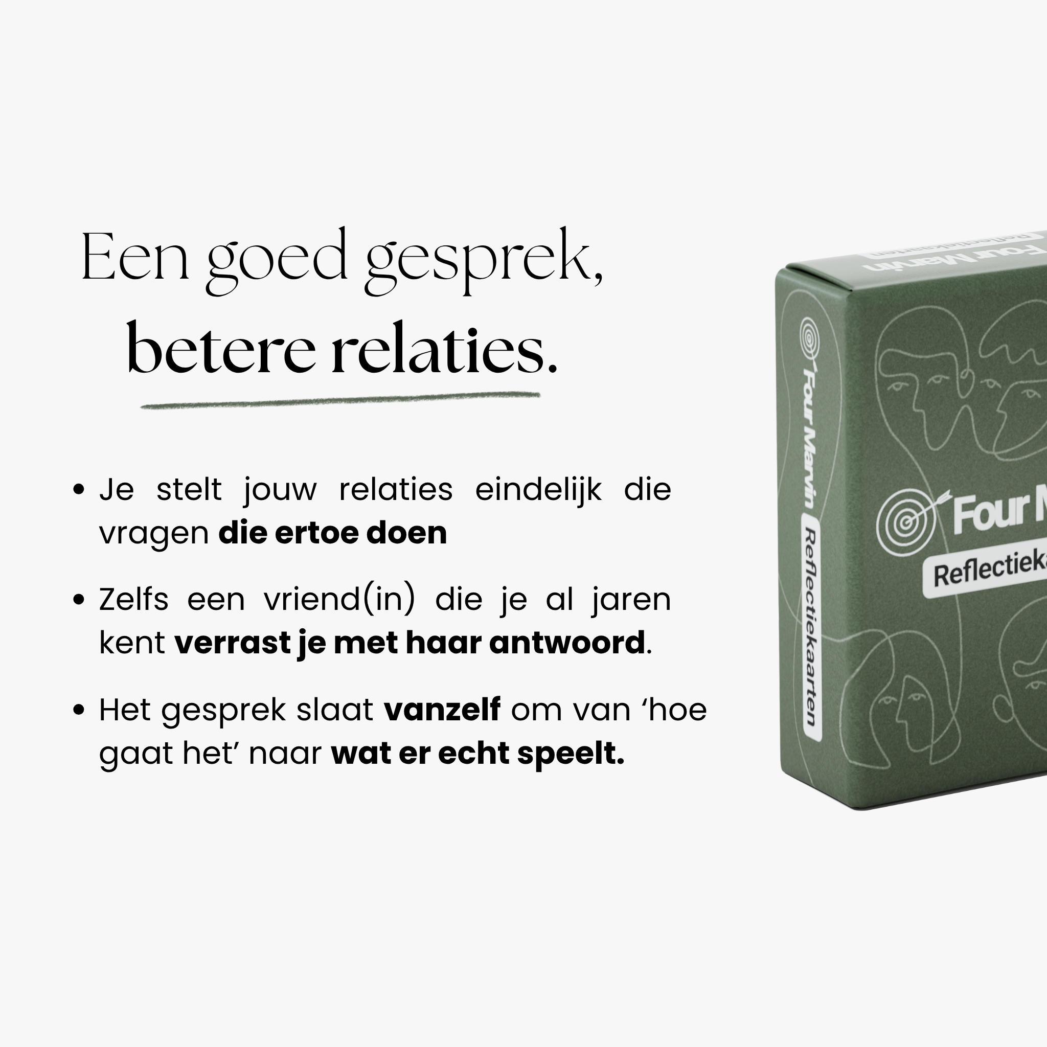 Nee. Sommige vragen zijn verdiepend, andere juist luchtig of verrassend. De kaarten zijn ontworpen voor echte gesprekken, zonder dat het voelt als therapie of een zwaar gesprek