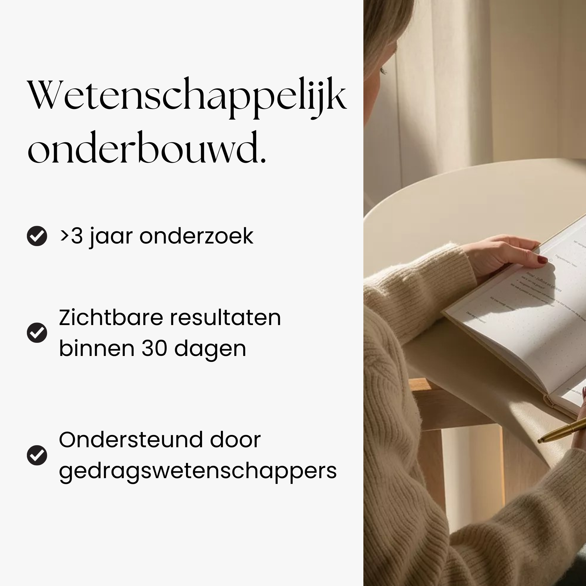 Eindelijk een journal die niet zweverig voelt, maar juist nuchter en helpend. Elke ochtend 5 minuten, en ik begin mijn dag zó veel helderder.