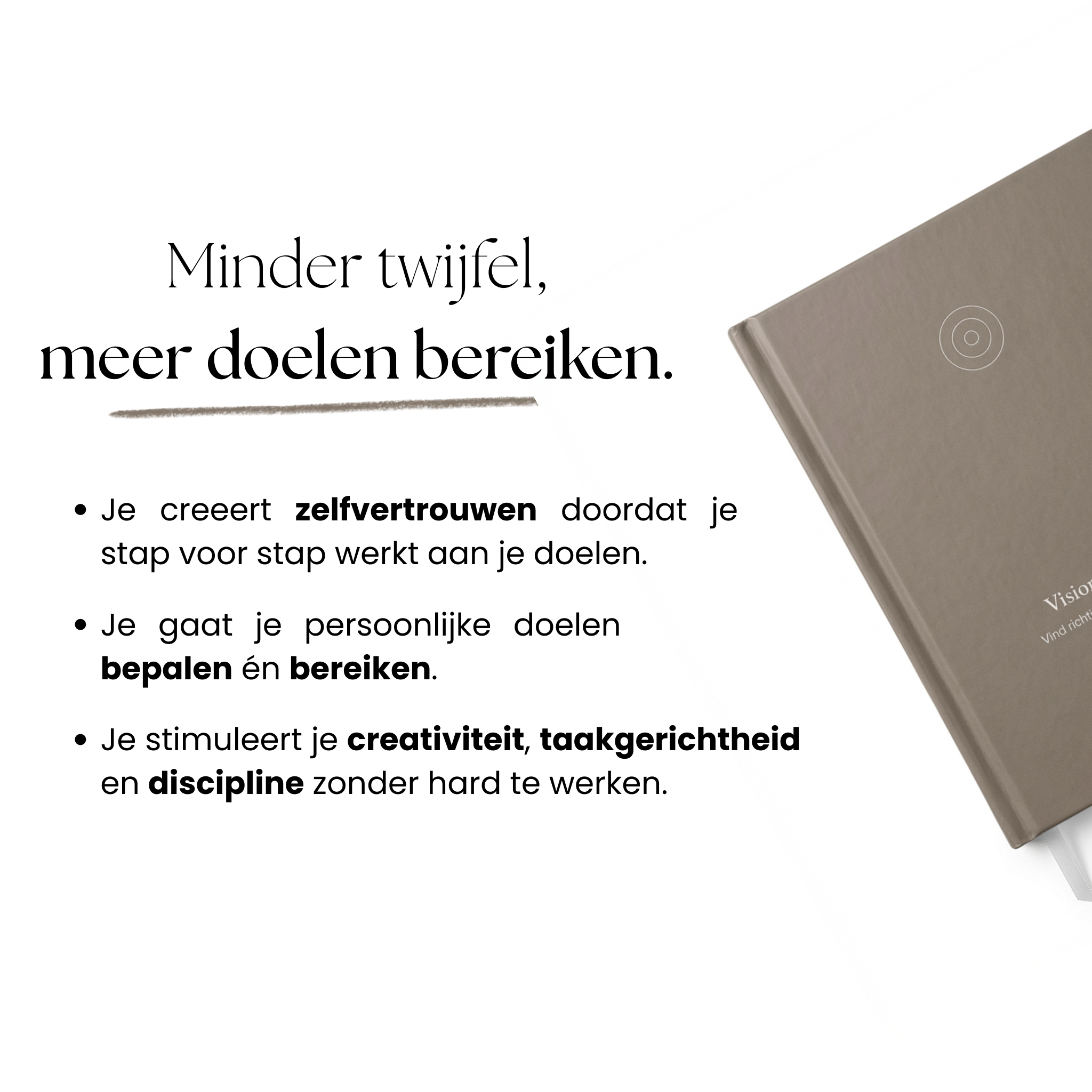 Doelen stellen is makkelijk. Ze halen is iets anders. De Vision Journal helpt je niet alleen doelen formuleren, maar ook afstemmen op jouw persoonlijke visie en ze opdelen in haalbare stappen. Het is een systeem, geen notitieboek.